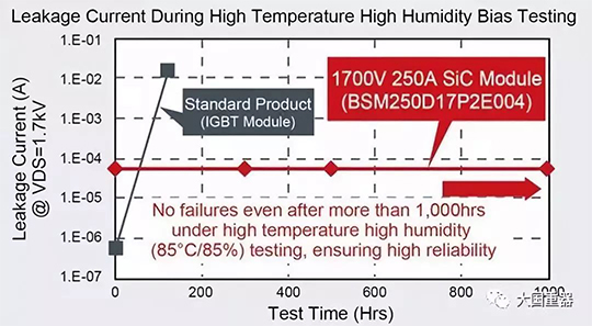 新型BSM250D17P2E004產(chǎn)品引入了一種新的封裝方法和涂層材料,以保護(hù)芯片免受介電擊穿,并抑制漏電流的增加,使模塊能夠通過HV-H3TRB可靠性測(cè)試。例如,在這種高壓、高溫、高濕度反向偏壓測(cè)試期間,當(dāng)在85°C和85%濕度下施加1360V超過1000小時(shí)時(shí),器件沒有出現(xiàn)故障,不同于傳統(tǒng)IGBT模塊,通常在1000小時(shí)以內(nèi)因電介質(zhì)擊穿而導(dǎo)致失效。為確保最高水平的可靠性,ROHM以不同的間隔測(cè)試了模塊的漏電流,最高阻斷電壓為1700V。